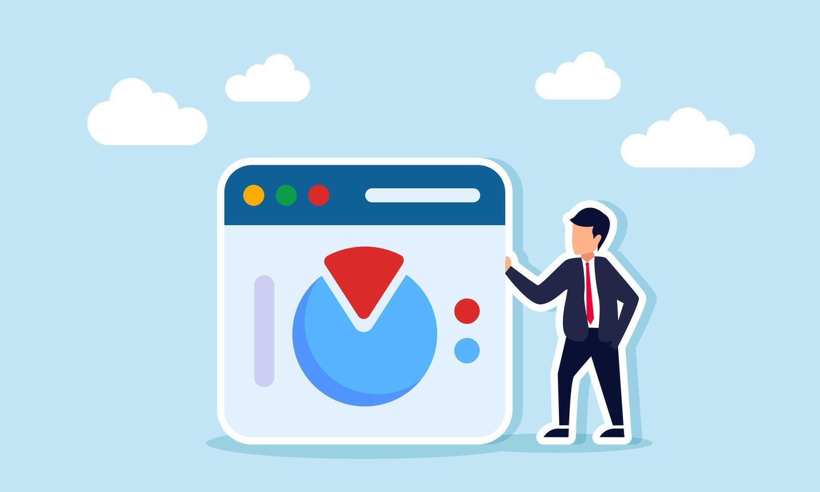 A businessman stands next to an app platform interface showing a pie chart, illustration of monitoring and evaluating business financial performance with digital data Pro Vector