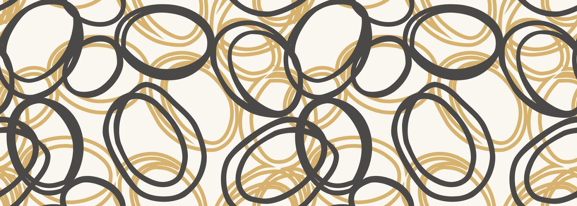 Seamless pattern with abstract hand drawn circles in black and gold on a light background. The overlapping rings create a modern, artistic, and dynamic composition vector