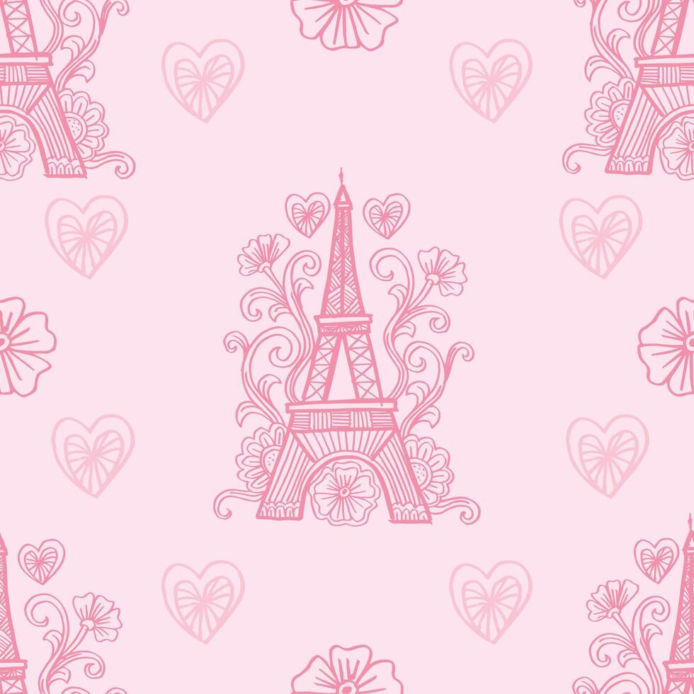 Seamless pattern with Eiffel tower and hearts and flower vector