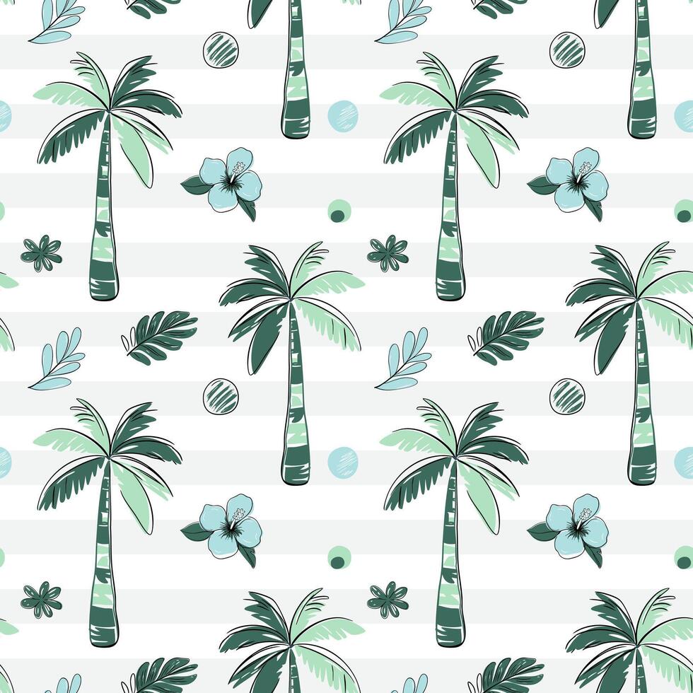 Seamless pattern with tropical flowers and palm trees with black outline. Tropical backckground. Sketch, line art drawing style. Pro Vector