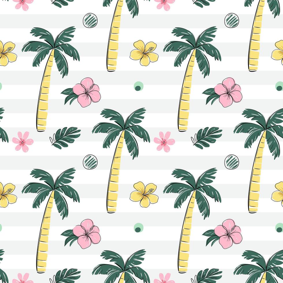 Seamless pattern with tropical flowers and palm trees with black outline. Sketch, line art drawing style. Tropical backckground. Pro Vector