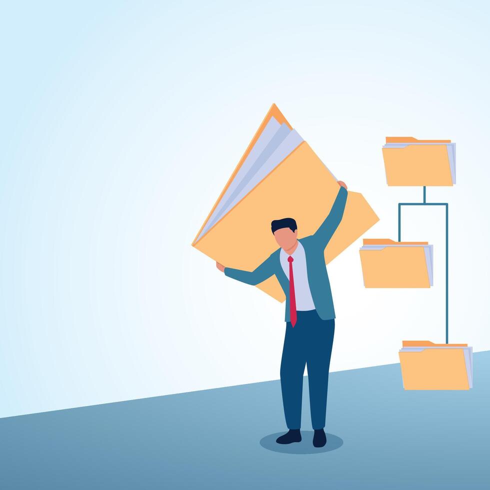 A man carrying a large folder on his head. A metaphorical illustration for data archiving, file organization and document access. Pro Vector