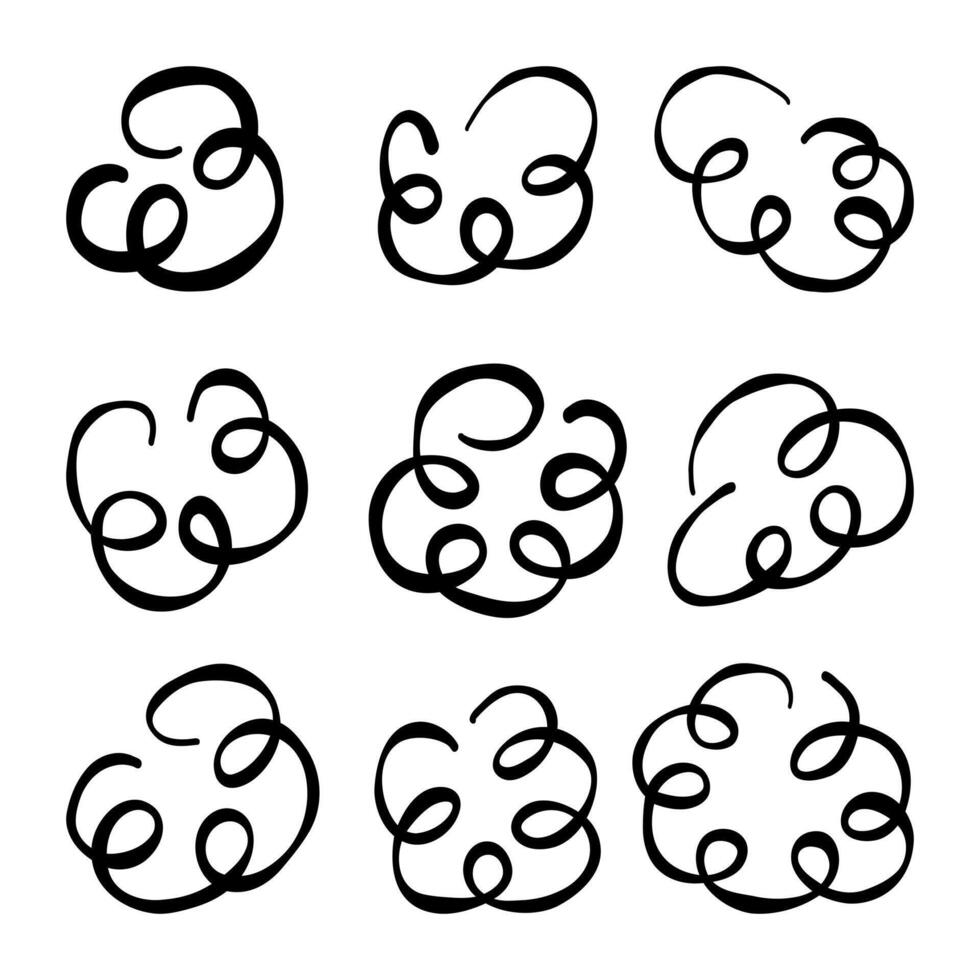 Hand Drawn Cloud Swirl Doodle Collection. A collection of 9 hand drawn cloud swirls featuring loops curls and abstract forms in bold black line art style with playful and airy flow Pro Vector