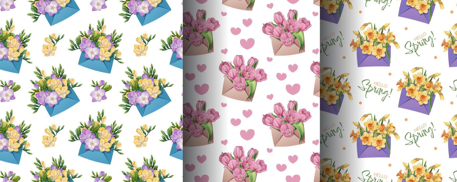 Spring Seamless Pattern Set with Daffodils, Tulips and Freesia in Envelope. Floral Background for Textiles, Wallpaper and Wrapping Paper. Pro Vector