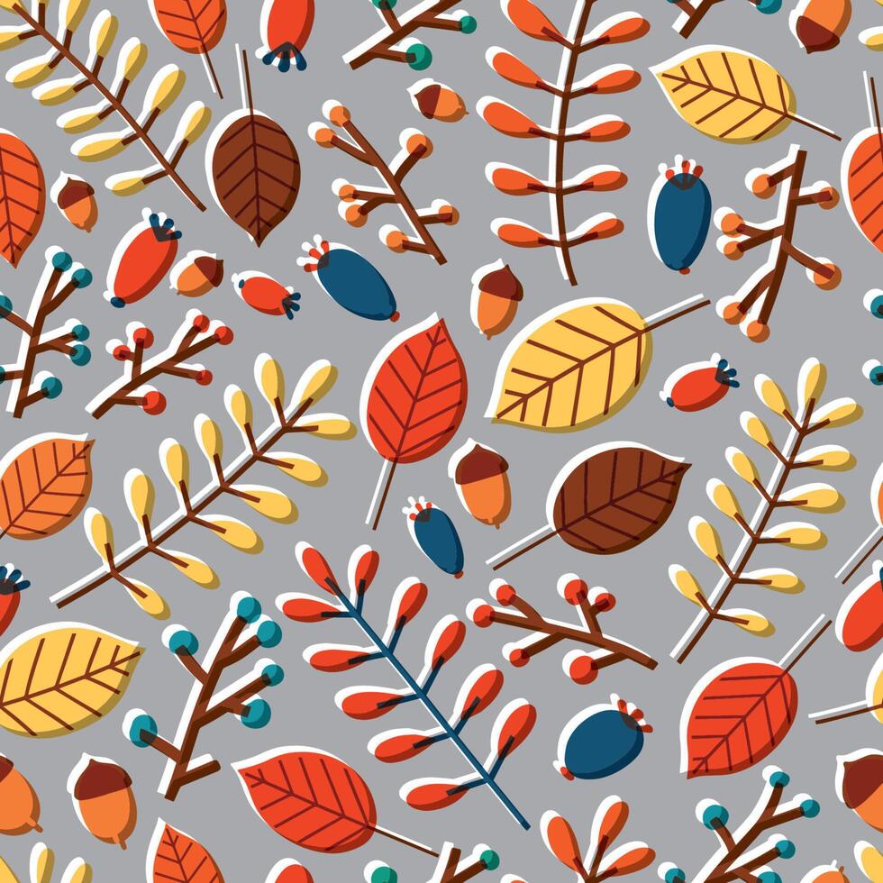 Modern seamless pattern with fallen leaves, tree branches, sprigs, twigs, acorns and berries on grey background. Autumn illustration in flat cartoon style for wrapping paper, fabric print. Pro Vector
