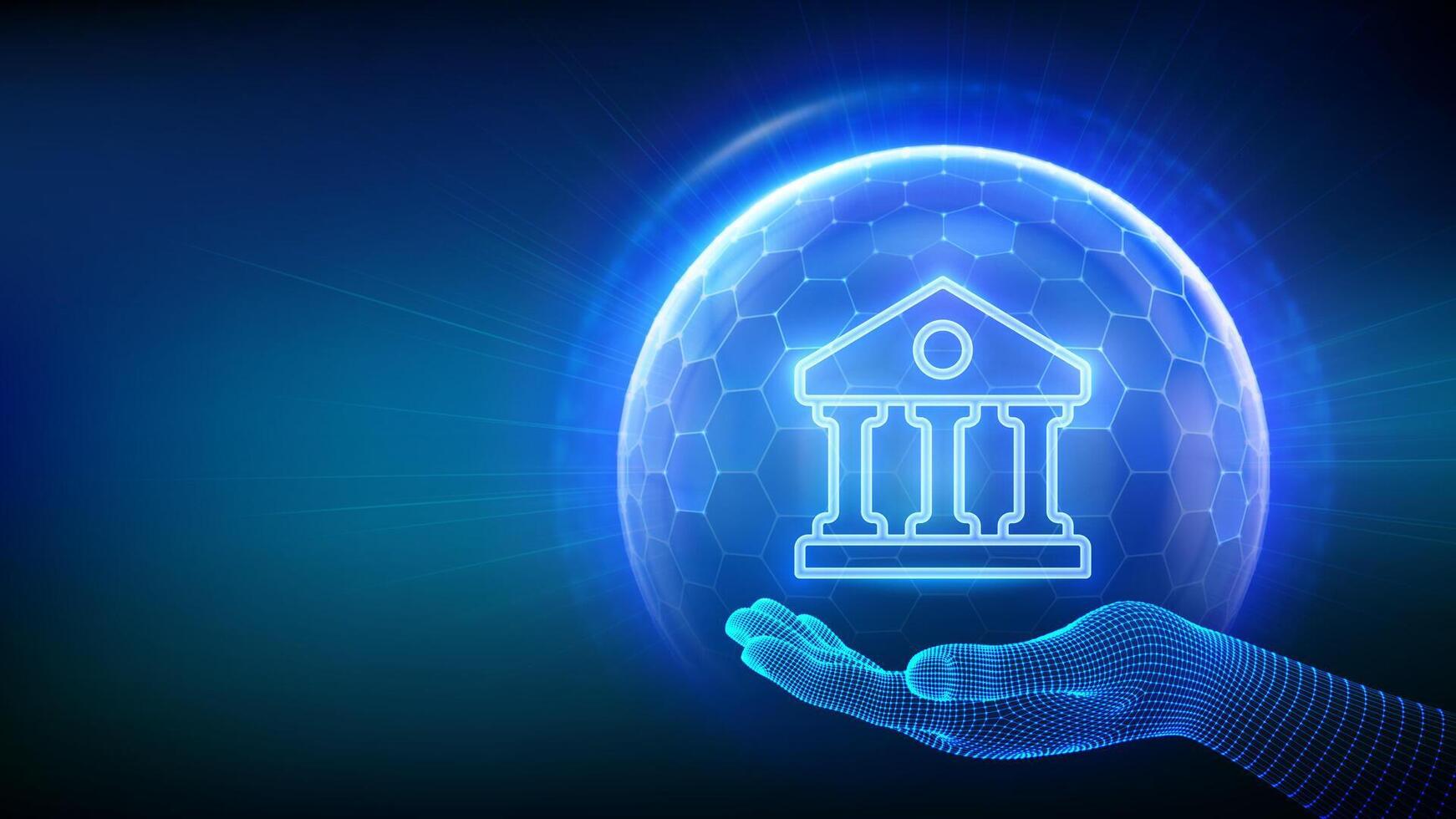 Banking. Online banking payment. Secure transactions. Financial data protection. Cyber security. Finance networking. Glass transparent sphere with surface of hexagons with Bank icon in hand. . Pro Vector