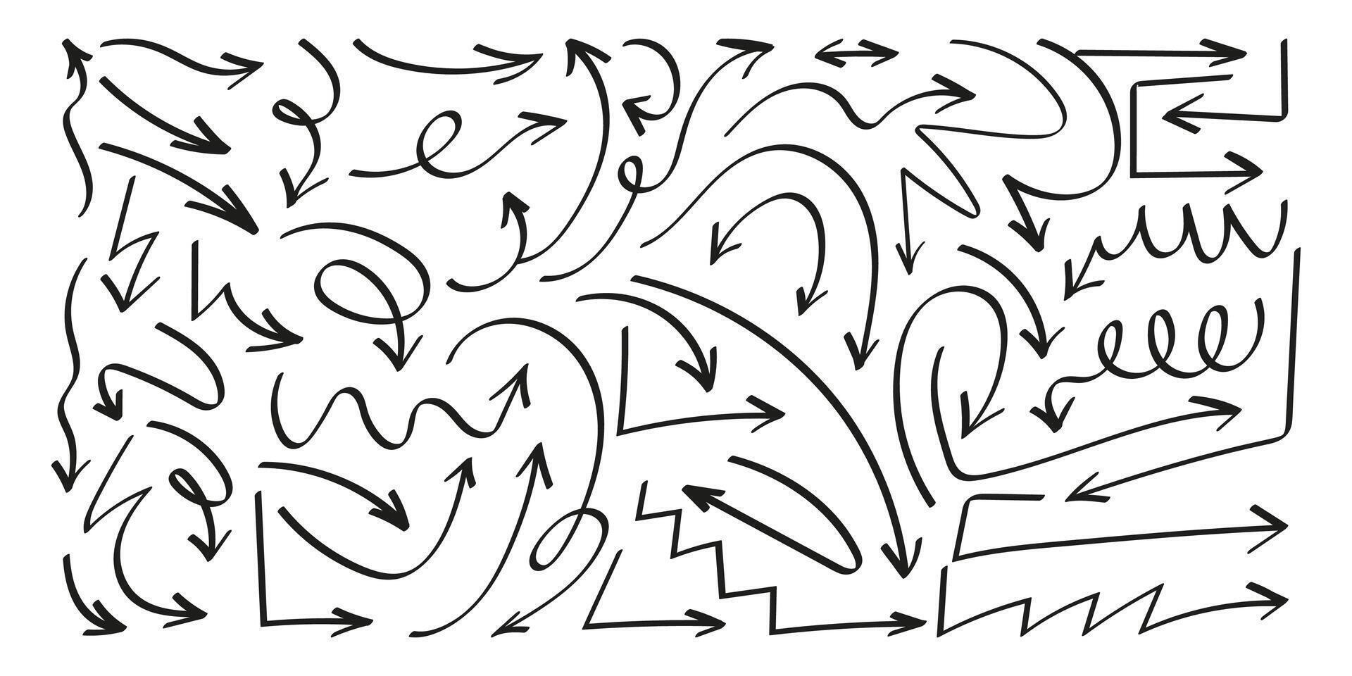 Arrows with Squiggle Curvy Lines and Loops in Hand Drawn Style. Set of doodle arrow icons. Collection of sketchy hand free curved lines and pointers Pro Vector