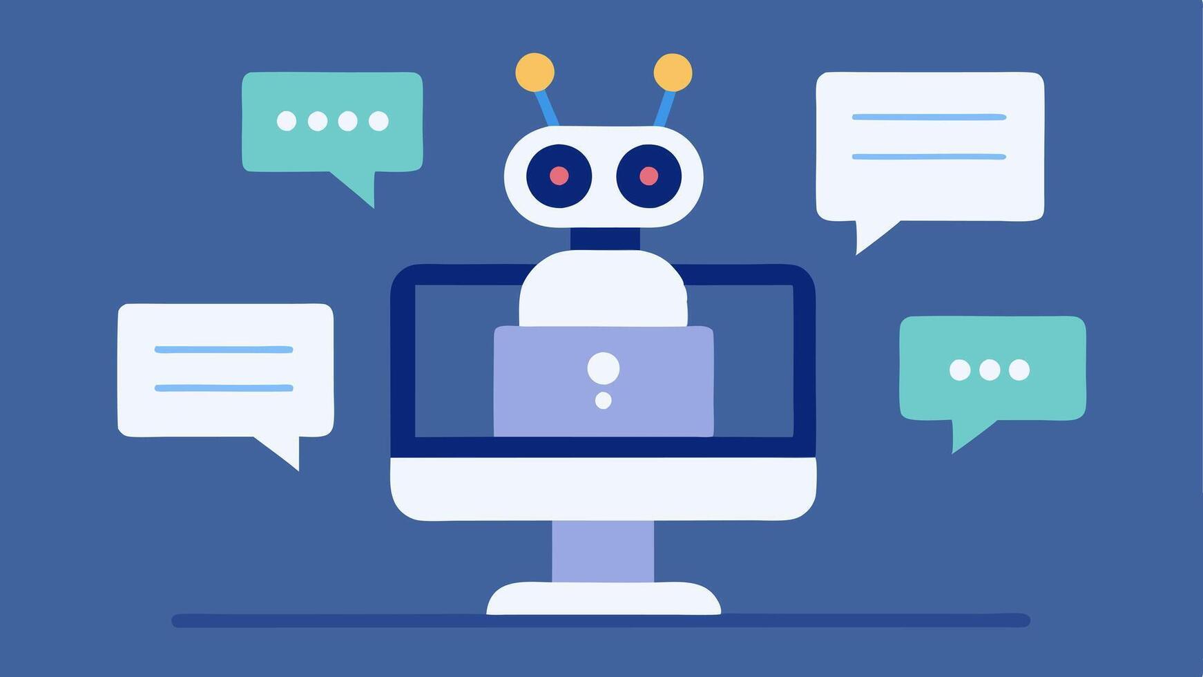 Chatbot Assistance An animated chatbot on a computer screen providing legal advice with speech bubbles displaying questions and answers related to legal queries.. Pro Vector