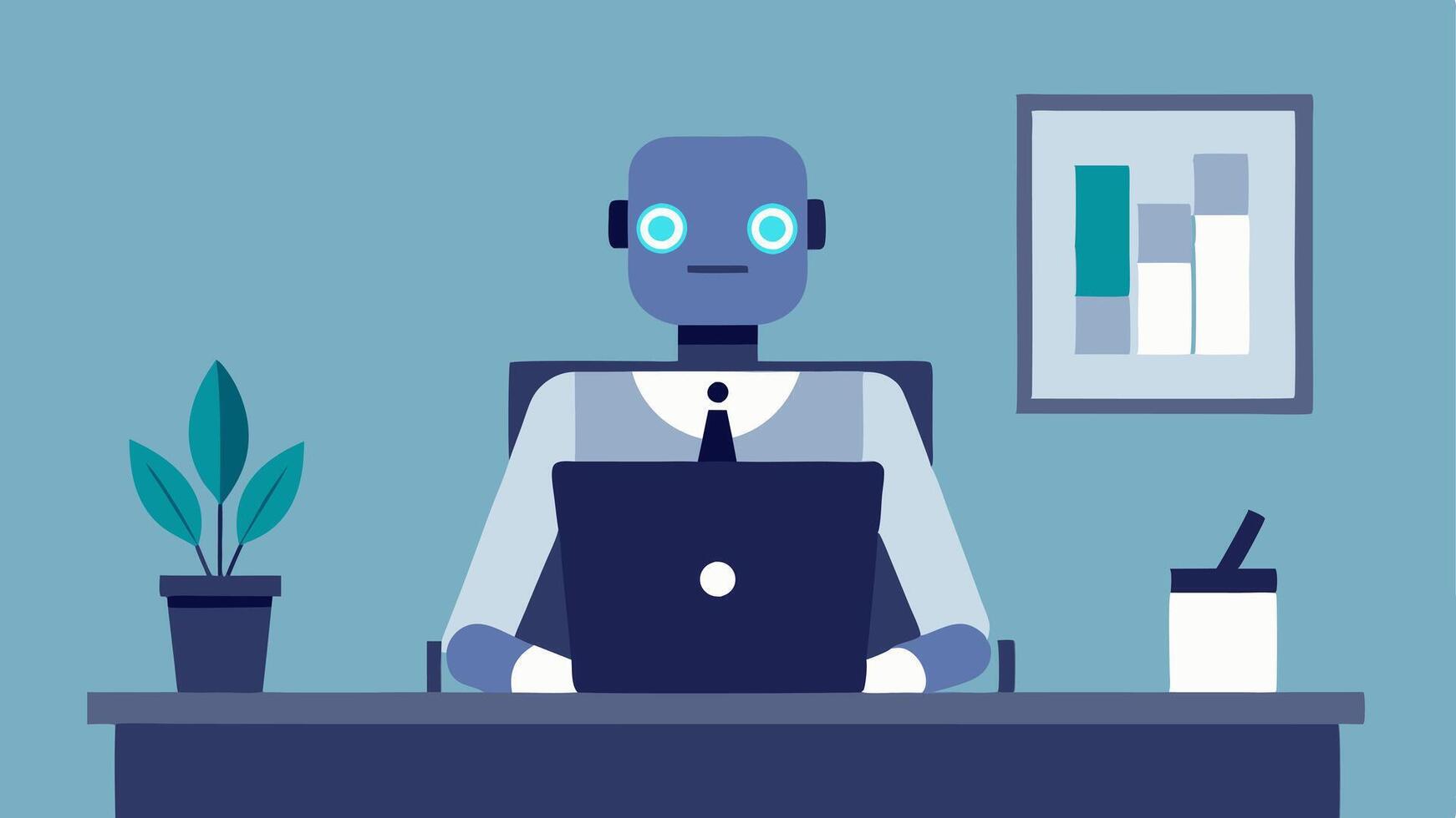 Office Encounter A sleek metallic robot sitting confidently at a modern desk typing on a computer with an efficient posture. The background features a few tered papers and an. Pro Vector