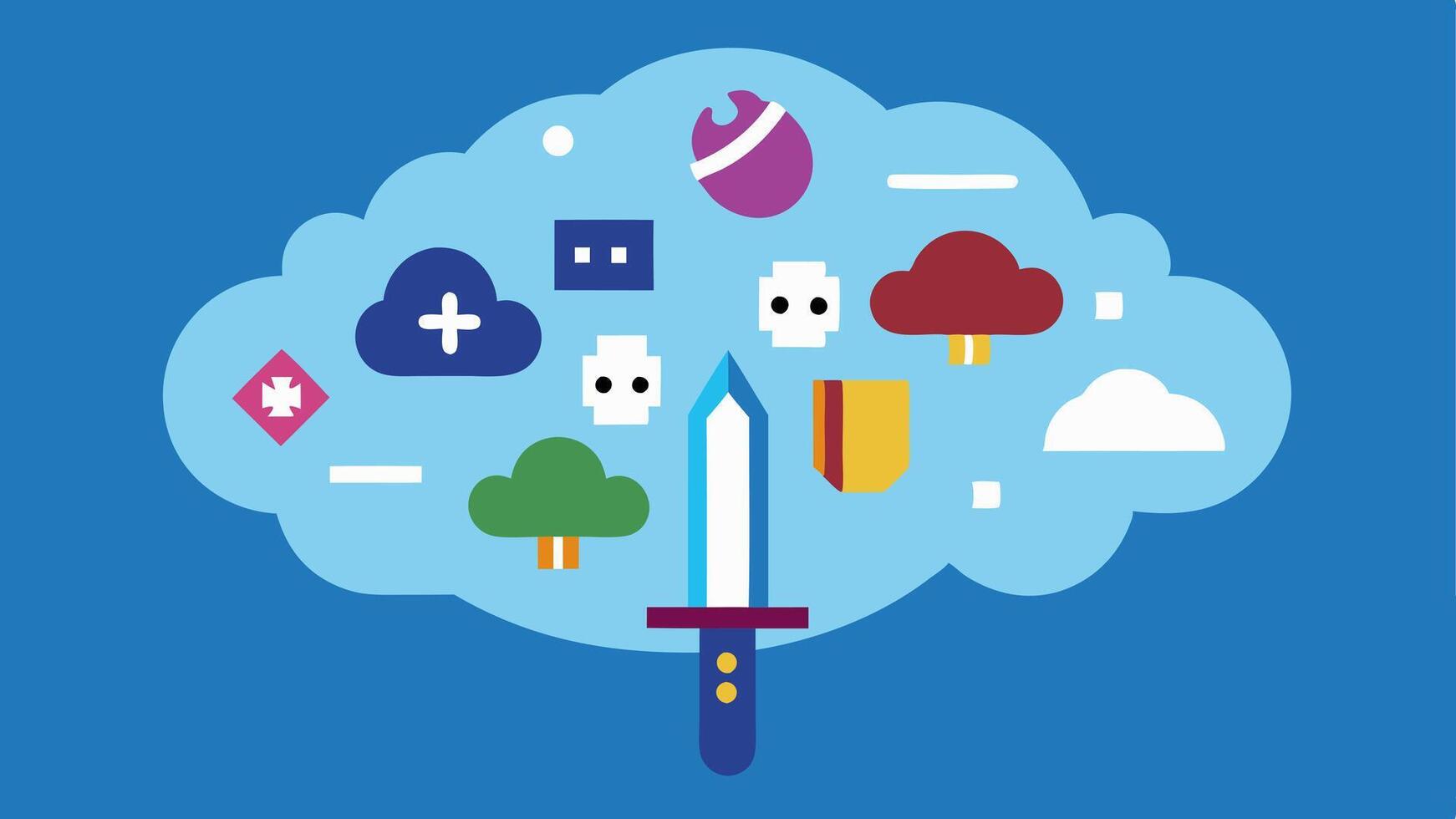 Game Library in the Cloud A visual of a stylized cloud filled with various game icons like swords cars etc. symbolizing a vast library of games accessible online.. Pro Vector