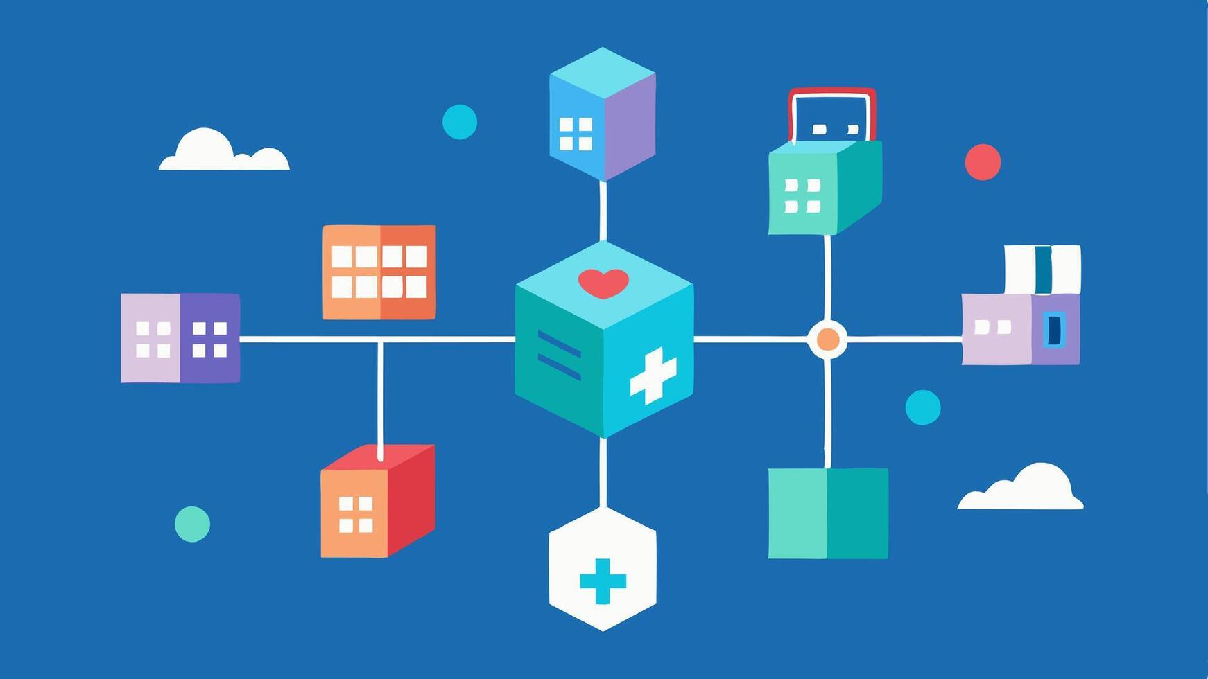 Interconnected Systems A visual of various healthcare systems like hospitals labs and pharmacies connected by a chain made of blocks illustrating the integration of blockchain in. Pro Vector
