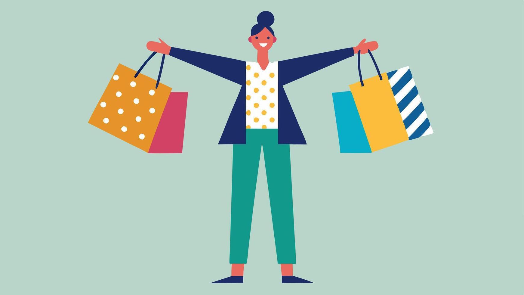 Fashionable Triumph An enthusiastic figure strikes a powerful pose with one leg forward showcasing an array of shopping bags in both hands. Each bag showcases unique patternspolka. Pro Vector