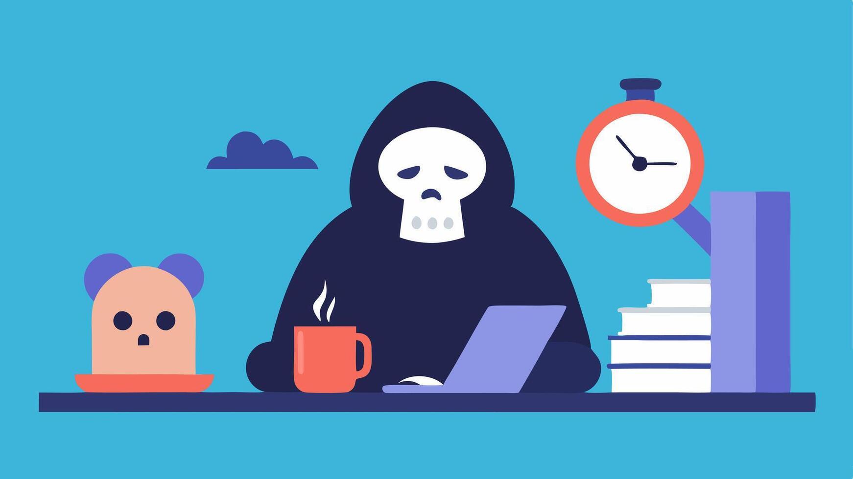 Messy Workspace In this illustration the Grim Reaper is seated at a cluttered desk piled with paper including a long scroll of names. His head rests in one hand and his expression. Pro Vector