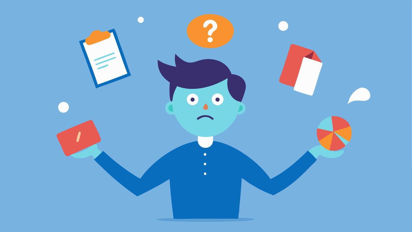 Balancing Act A character juggling various social invitations and personal responsibilities all while looking frazzled and anxious representing the struggle to make choices amid. Pro Vector