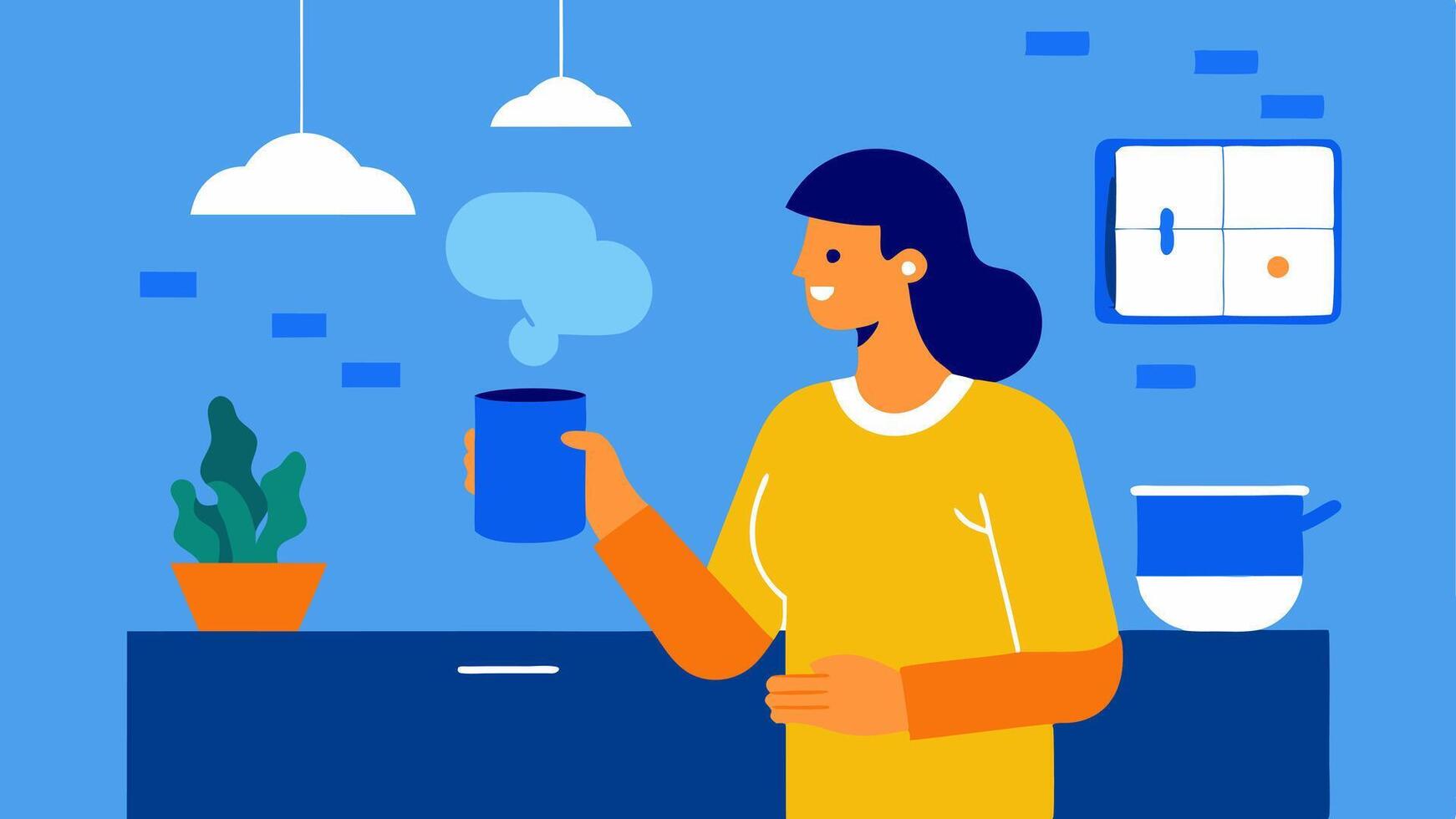 Morning Routine A character in a bright kitchen asking a voice assistant for the weather while sipping coffee with a smart speaker on the countertop.. Pro Vector