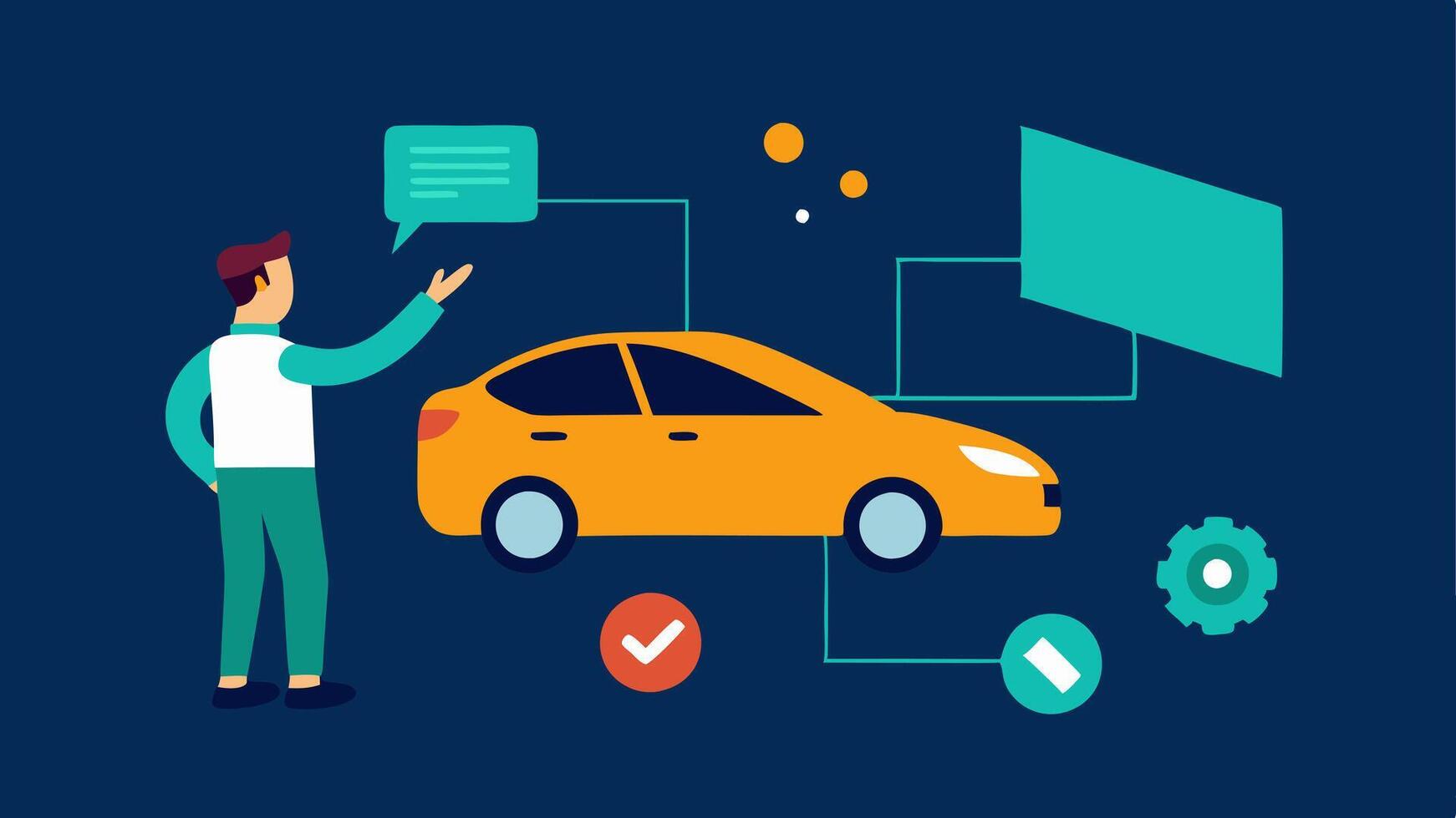 Interactive 3D Model A designer reaching out to manipulate a glowing interactive 3D model of a car with interface elements floating around them.. Pro Vector