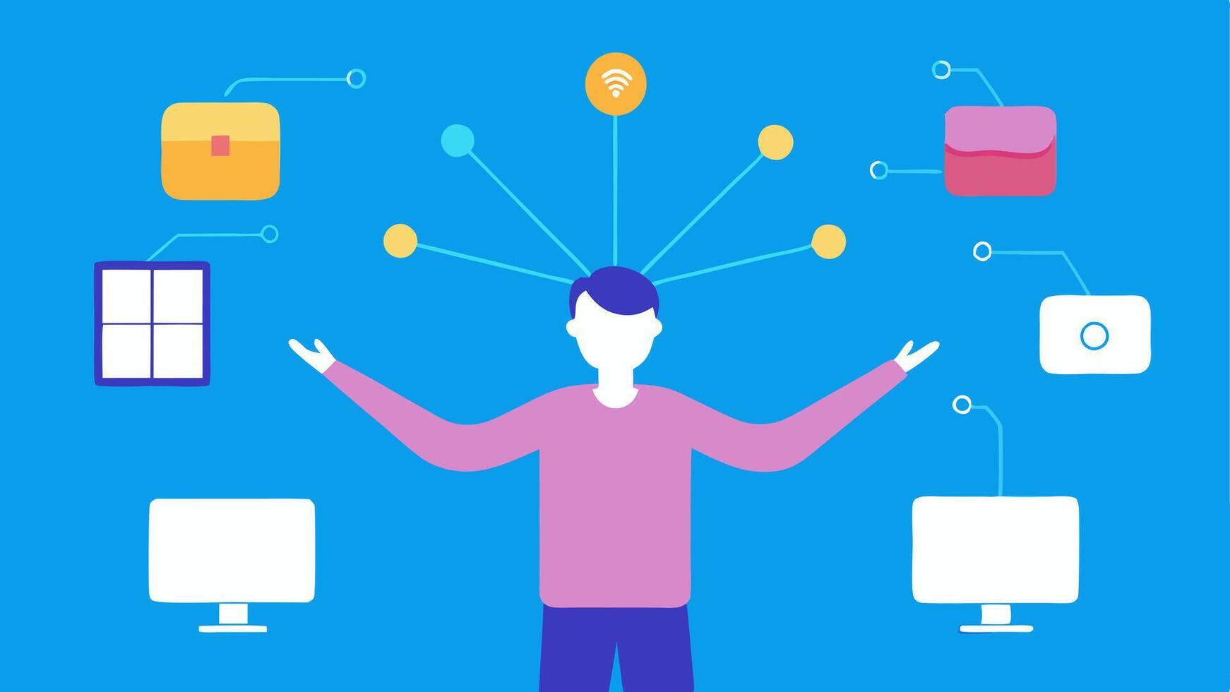 Neural Gesture Interaction A user stands with their arms raised fingers spread wide. Above them neural signals are depicted as bright trails connecting to various devices like. Pro Vector