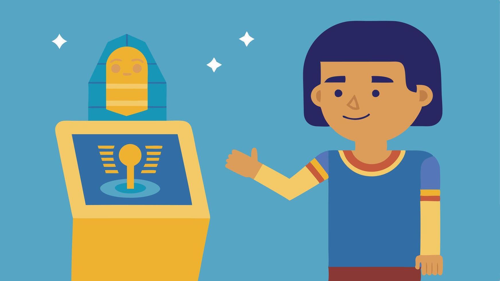 Augmented Reality Screen A closeup of an interactive touchscreen kiosk that projects a 3D model of an Egyptian sarcophagus allowing a child to spin and zoom in on hieroglyphics.. Pro Vector