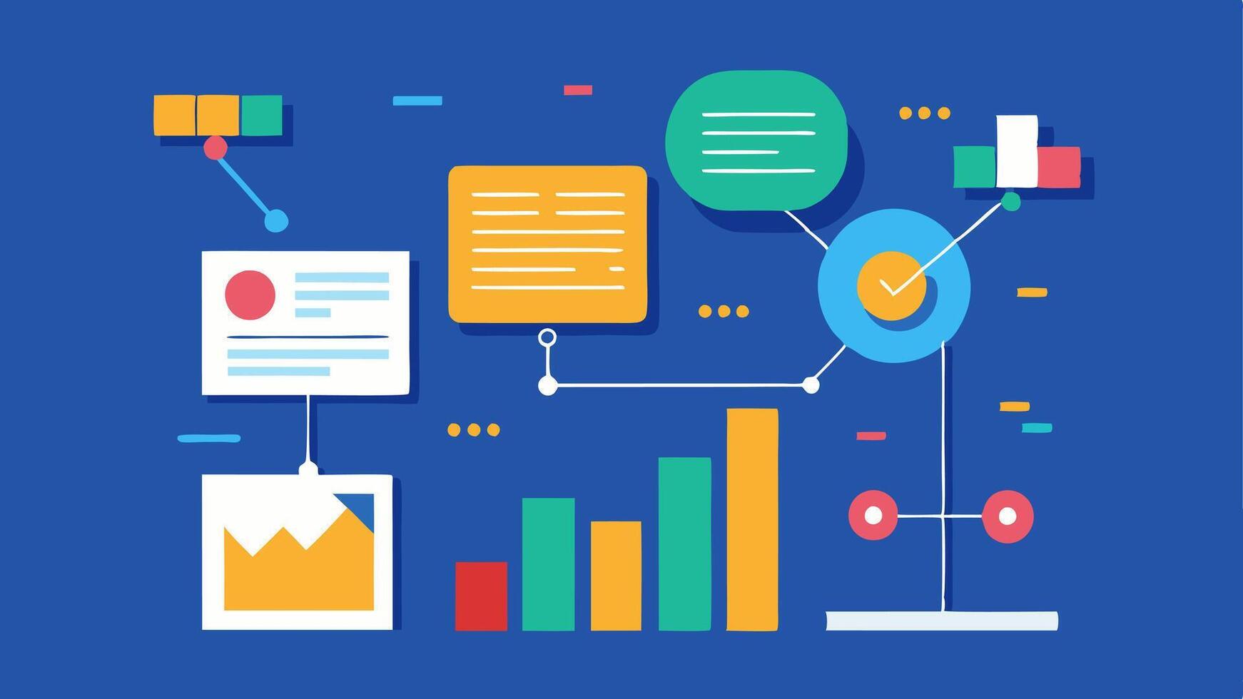 Market Analysis Layers Layers of information represented as horizontal bands filled with data over which an AI figure scans and summarizes key insights showcasing its ability to p. Pro Vector