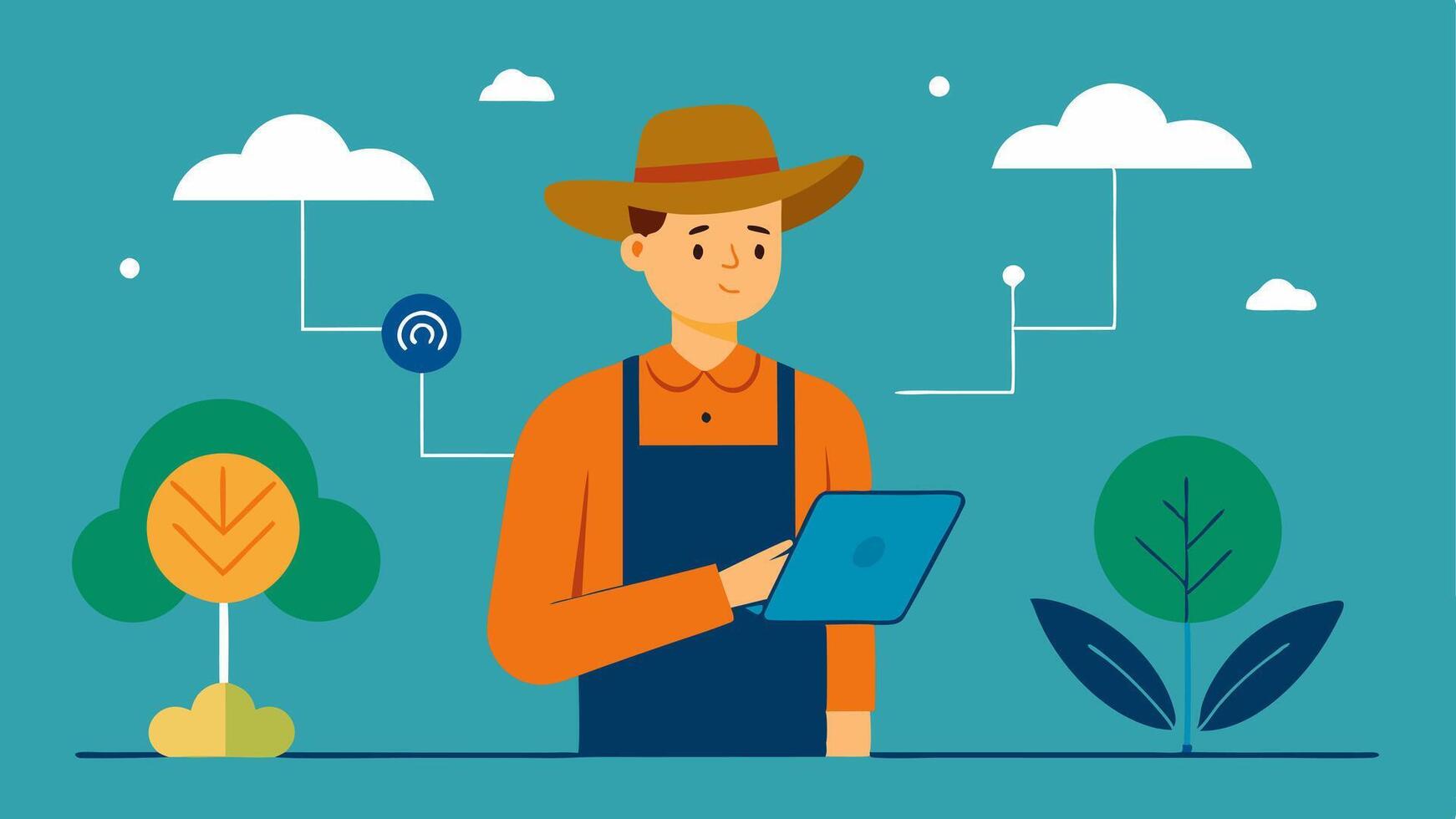 Crop Health Analysis A farmer using a tablet that connects to an AI system analyzing crop health data gathered from sensors p in various parts of the field.. Pro Vector