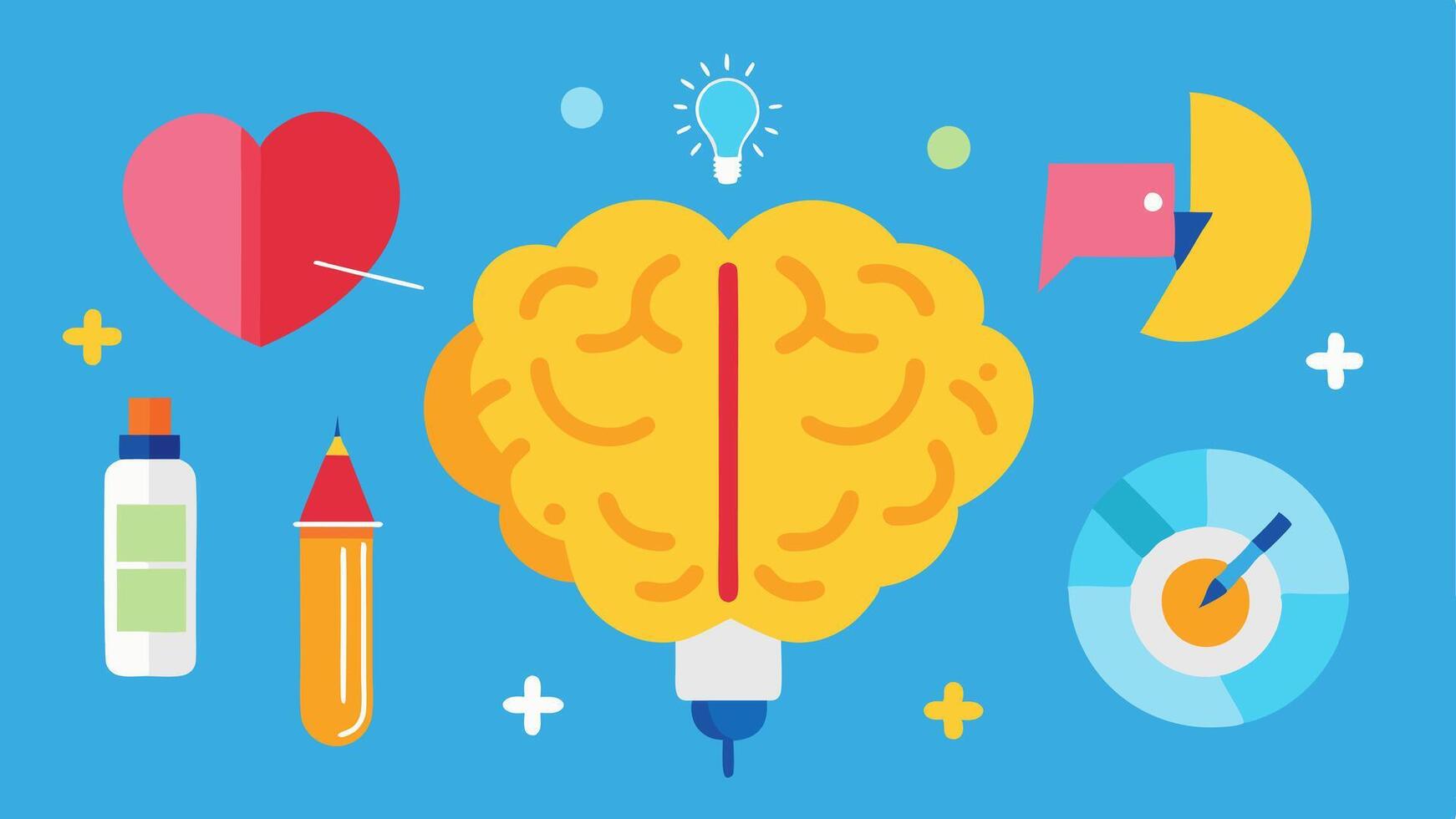 Brain with Therapy Tools A brain illustration surrounded by various therapy tools such as a notebook a pencil a heart and a light bulb symbolizing reflection emotion and ideas.. Pro Vector