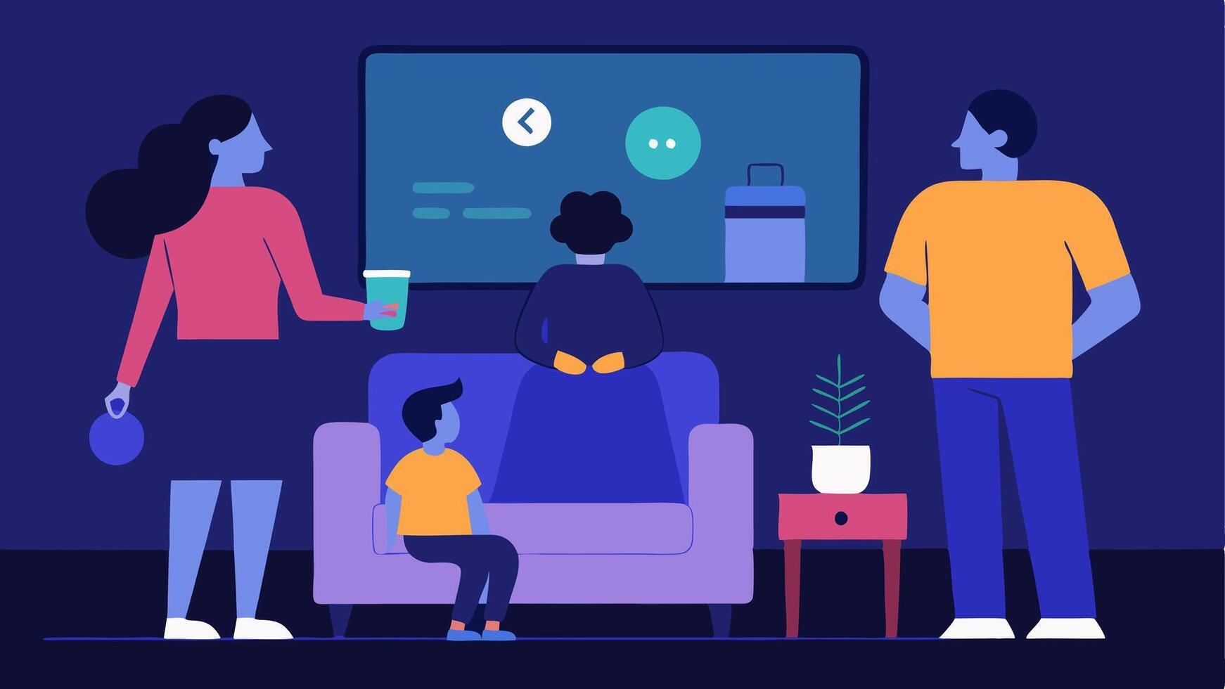 Media Playback A family gathered in a living room with a smart display in front of them as one member uses voice commands to select a movie visualized by onscreen playback choices.. Pro Vector