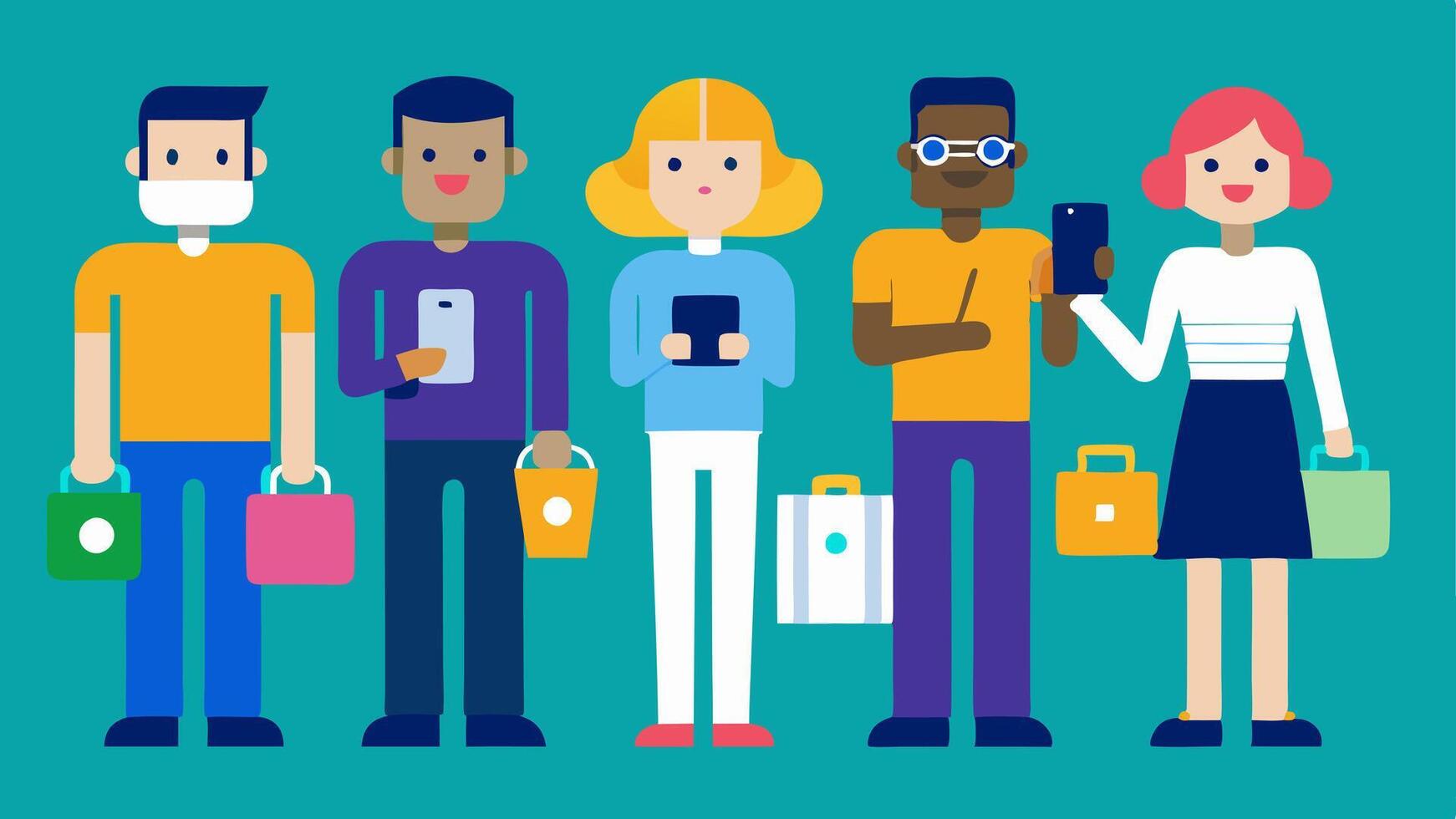 Group of Consumers A crowd of diverse simplified characters holding various items like smartphones and shopping bags with an AI figure analyzing their preferences on a tablet.. Pro Vector