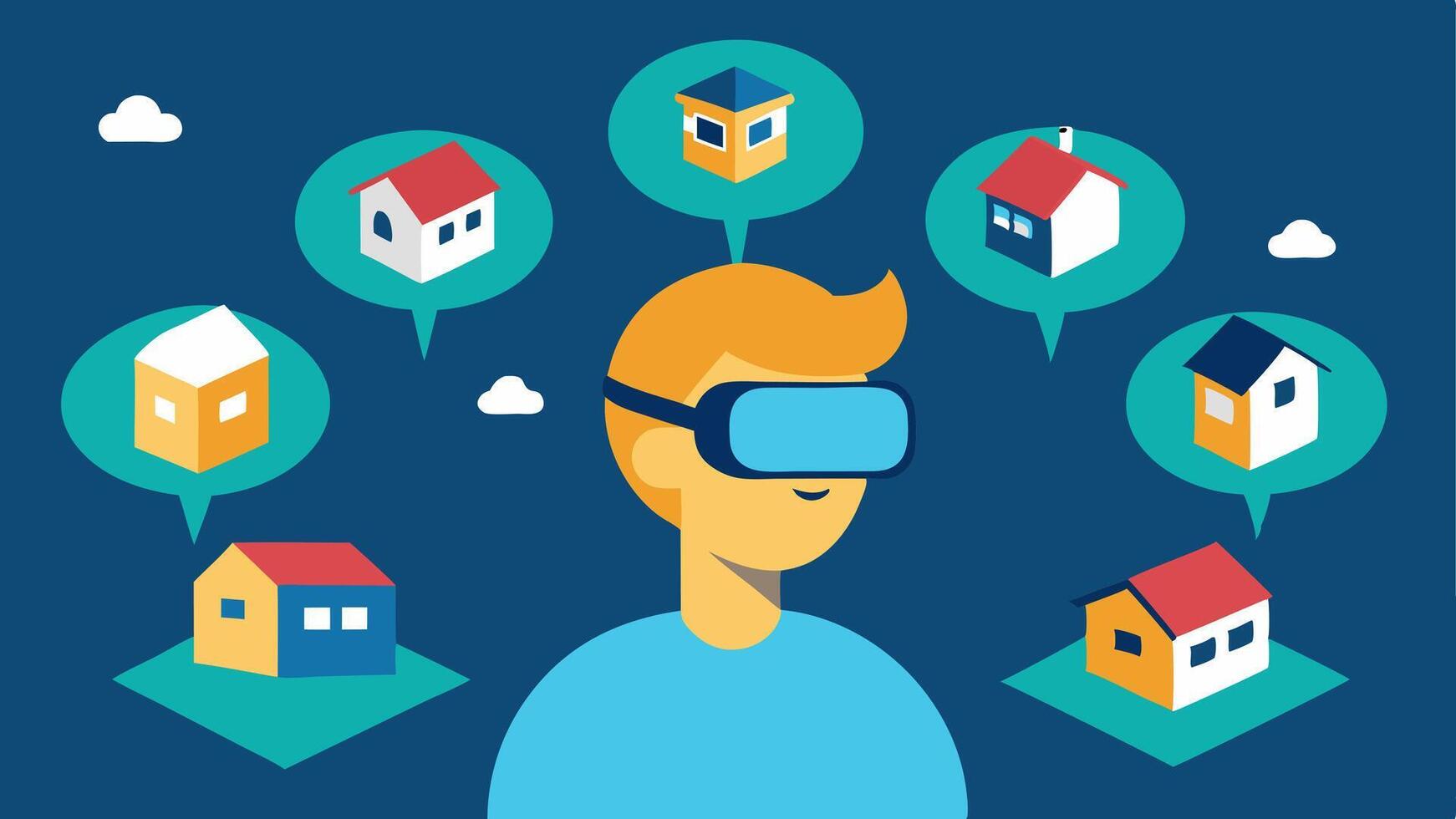 Augmented Property Map An aerial view of a neighborhood with icons representing different houses. A user with VR goggles is shown interacting with the map highlighting features of. Pro Vector