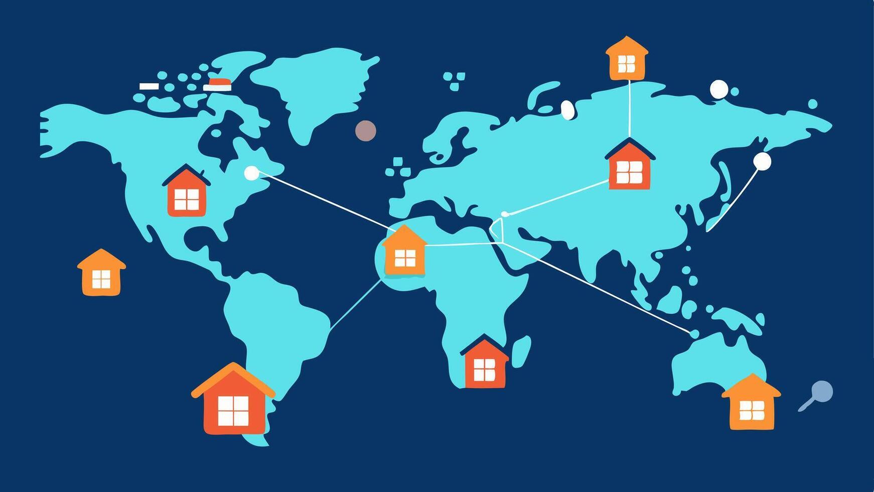 Global Connection Map with Properties A world map with house icons connected by blockchain lines showing global real estate transactions secured by blockchain.. Pro Vector