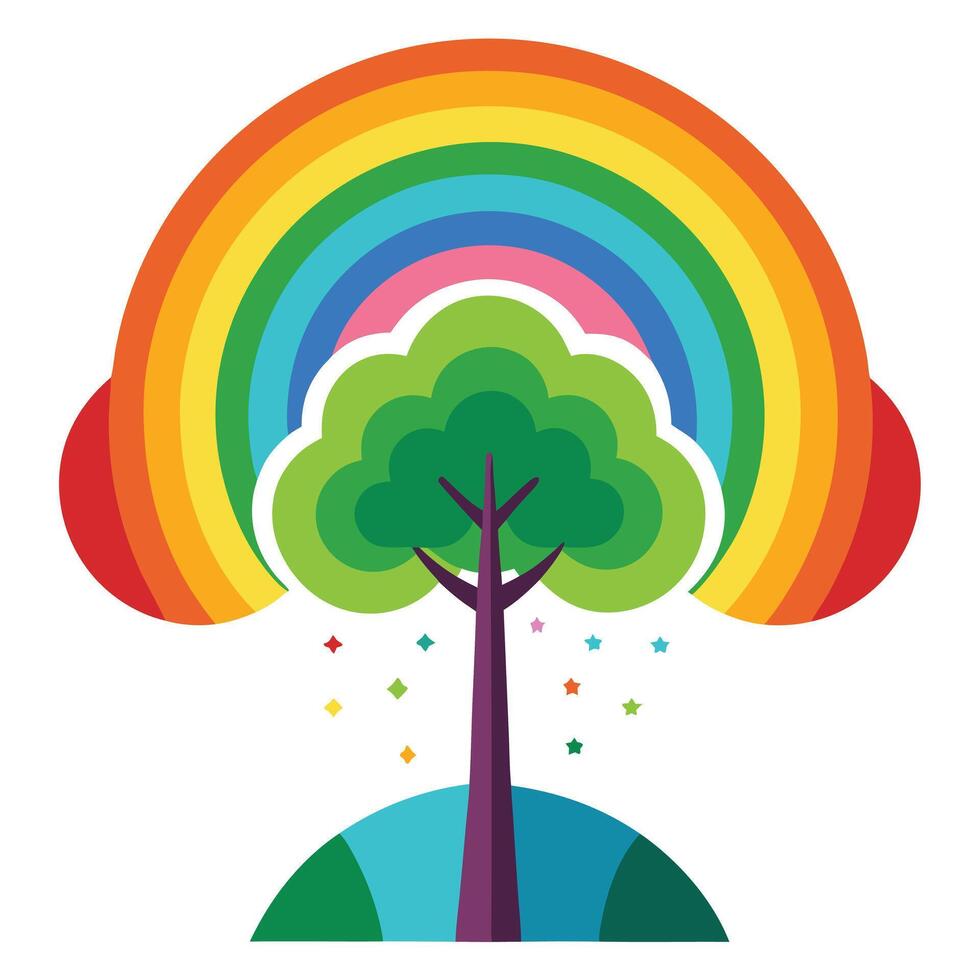 Flat Tree with a Rainbow Canopy in a Whimsical Setting Pro Vector