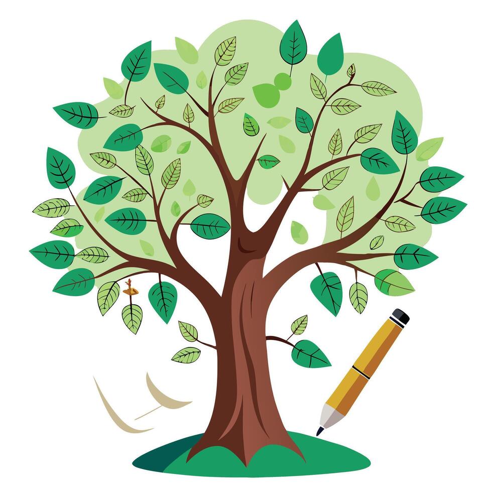 Inspiring tree design with leaf-shaped paper notes and a pen for creative thinking and note-taking Pro Vector