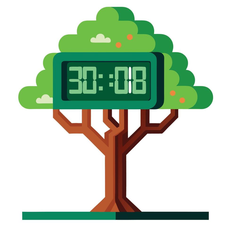 Timely tree illustration with leaves forming a digital clock display representing time Pro Vector