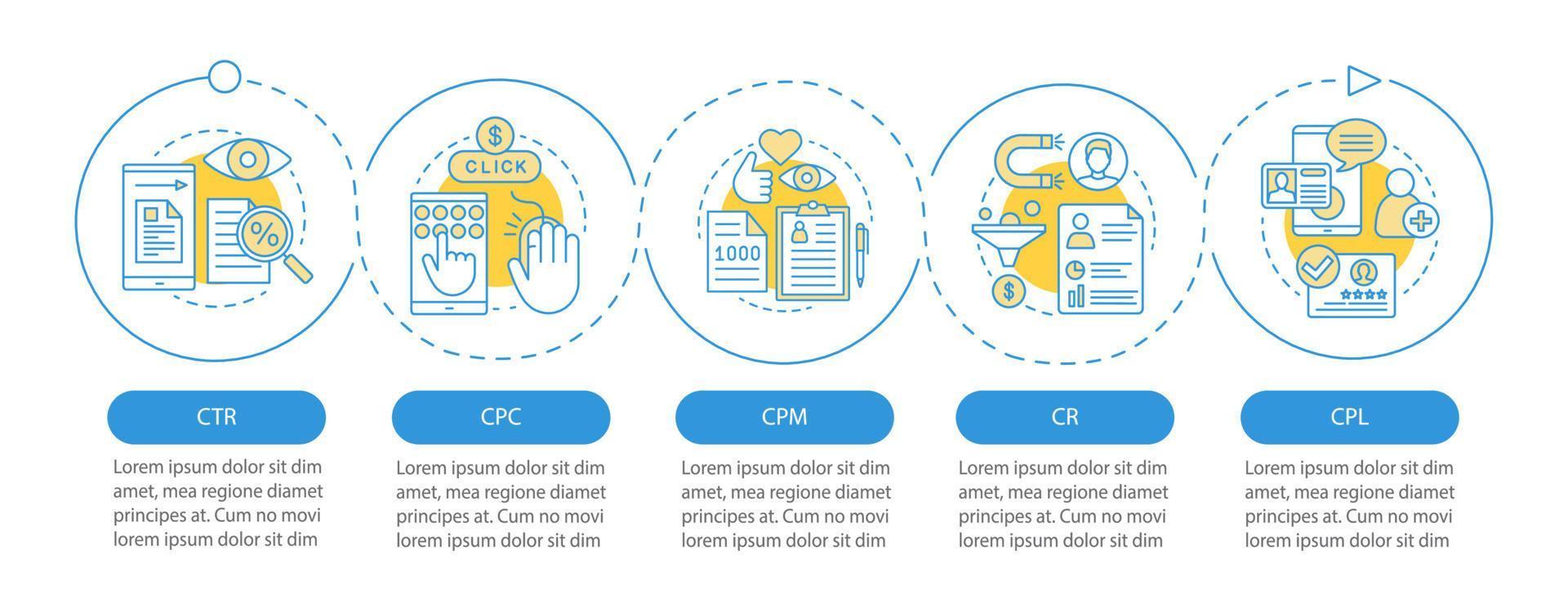 Advertising metrics vector infographic template. Business presentation design elements. Digital marketing. Data visualization with steps and options. Process timeline chart. Workflow layout with icons Pro Vector