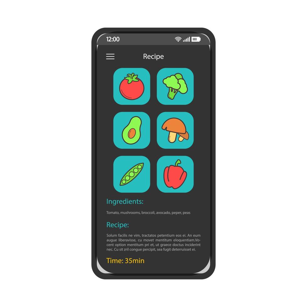 Discover recipes smartphone interface vector template. Mobile app page black design layout. Cooking instructions, food ingredients screen. Flat UI for application. Grocery list ..on phone display .. Pro Vector