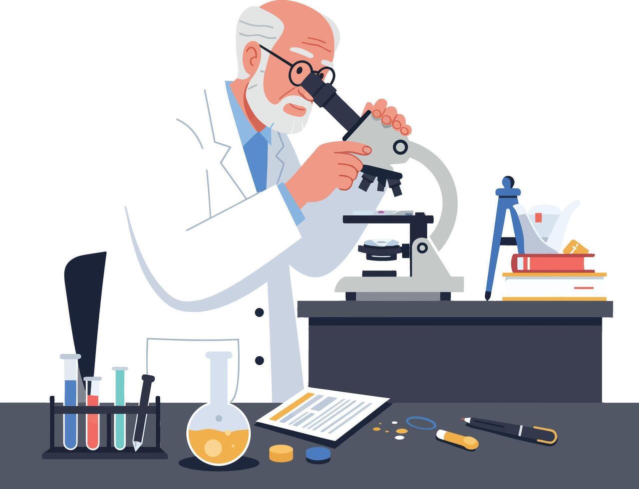 Scientist examining samples with microscope in flat style art Pro Vector