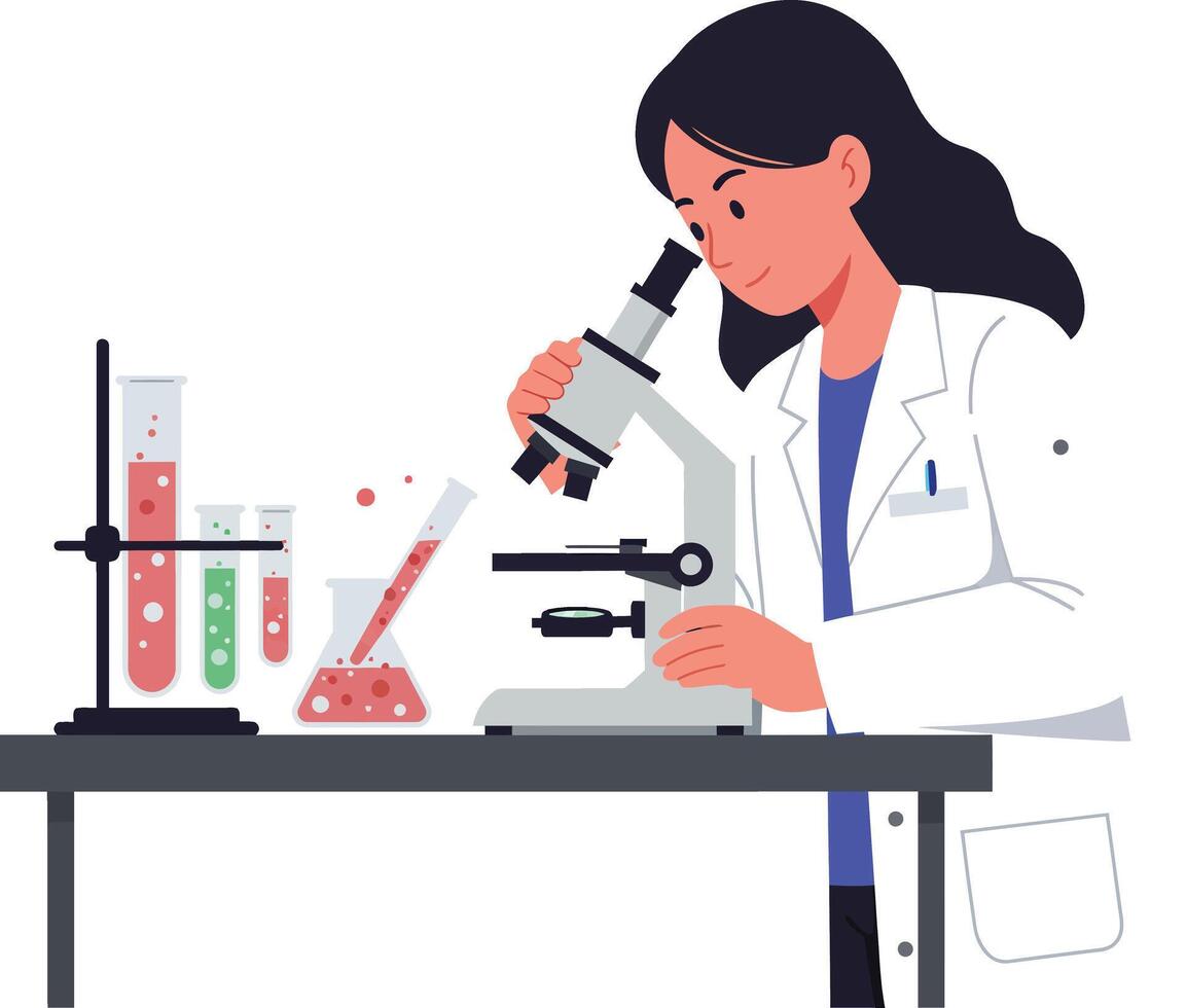 Scientist examining samples using a microscope in a laboratory setting with test tubes Pro Vector