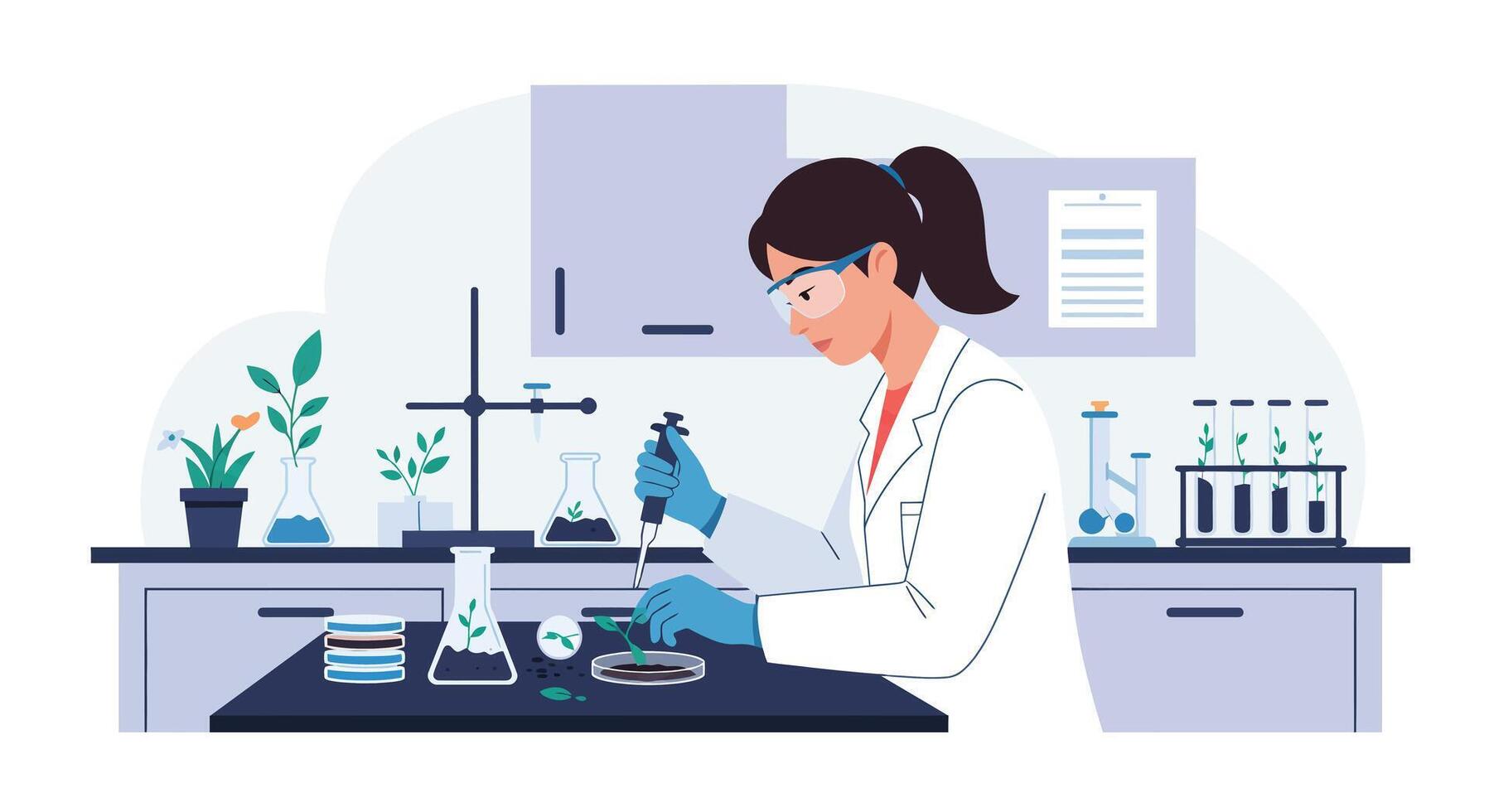 Scientist conducting experiments in a laboratory setting with flat art Pro Vector