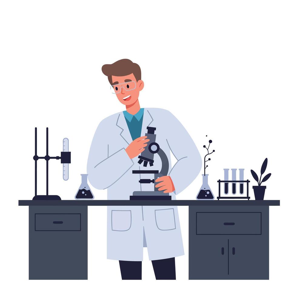 Scientist working with microscope in modern laboratory flat art Pro Vector