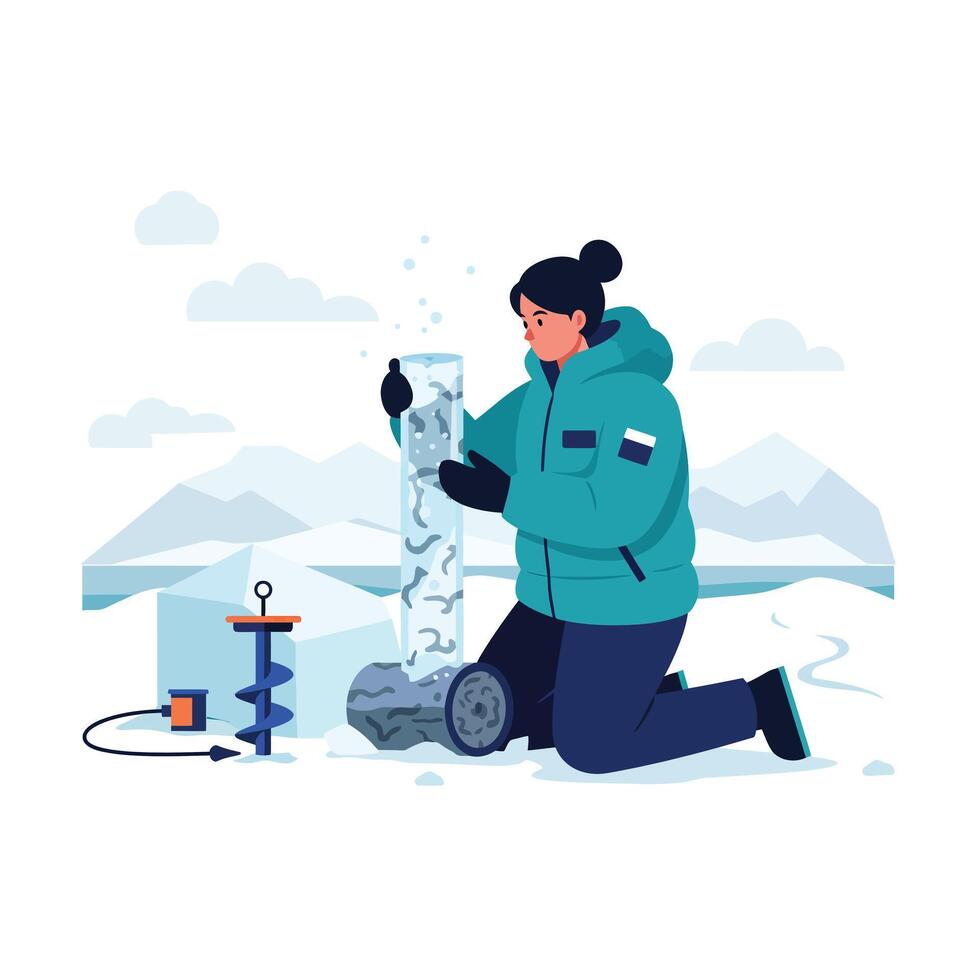 Scientist analyzing ice core with tools in cold environment flat illustration Pro Vector