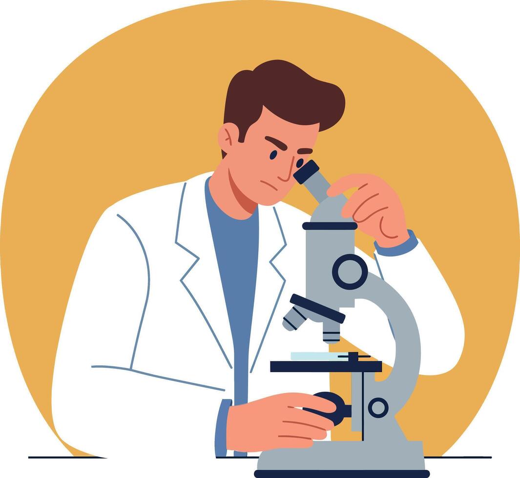 Scientist examining slides at a microscope in a flat illustration Pro Vector