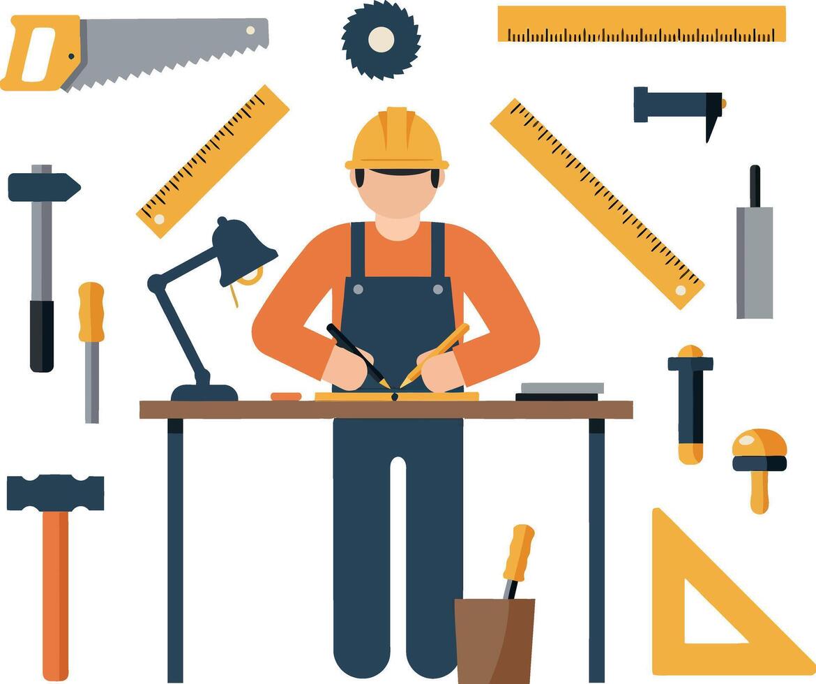 Carpenter working at a table surrounded by tools in flat art Pro Vector
