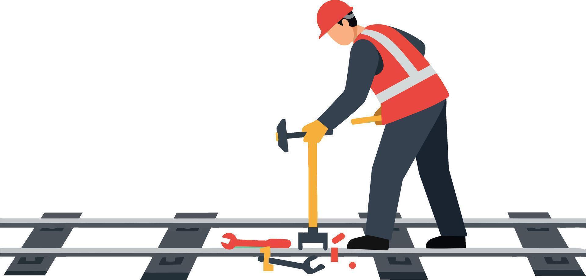 Worker adjusting railway tracks with tools in a flat, minimal illustration Pro Vector