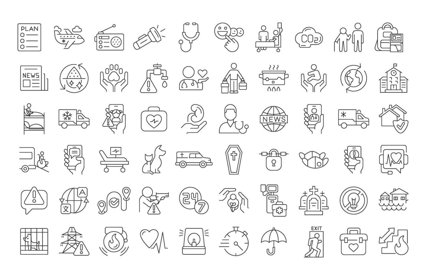 Emergency response linear icons set. Public safety and rescue service. Protection from vary dangers. Customizable thin line symbols. Isolated outline illustrations. Editable stroke Pro Vector
