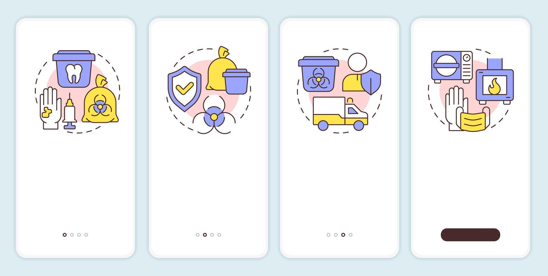 Medical waste management onboarding mobile app screen. Hazard, infection. Walkthrough 4 steps editable graphic instructions with linear concepts. UI, UX, GUI Pro Vector