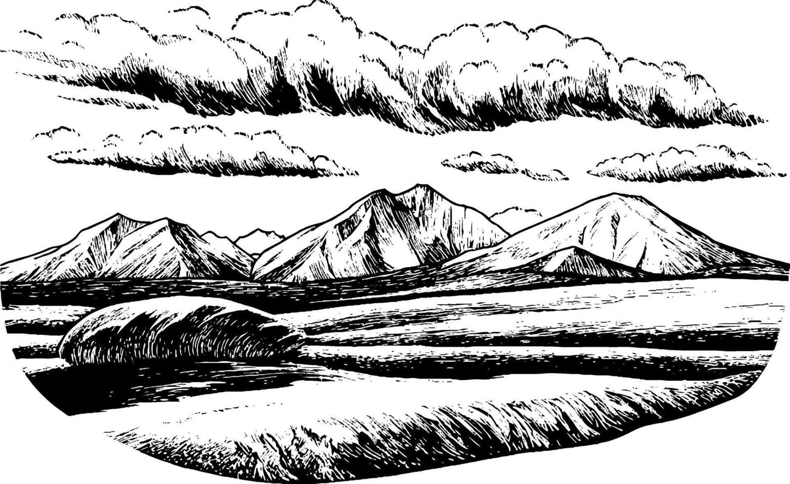 A black and white illustration of a mountainous landscape featuring rolling hills and clouds in the sky. The mountains are depicted with sharp peaks and varying textures, while the foreground includes smooth hills. Pro Vector