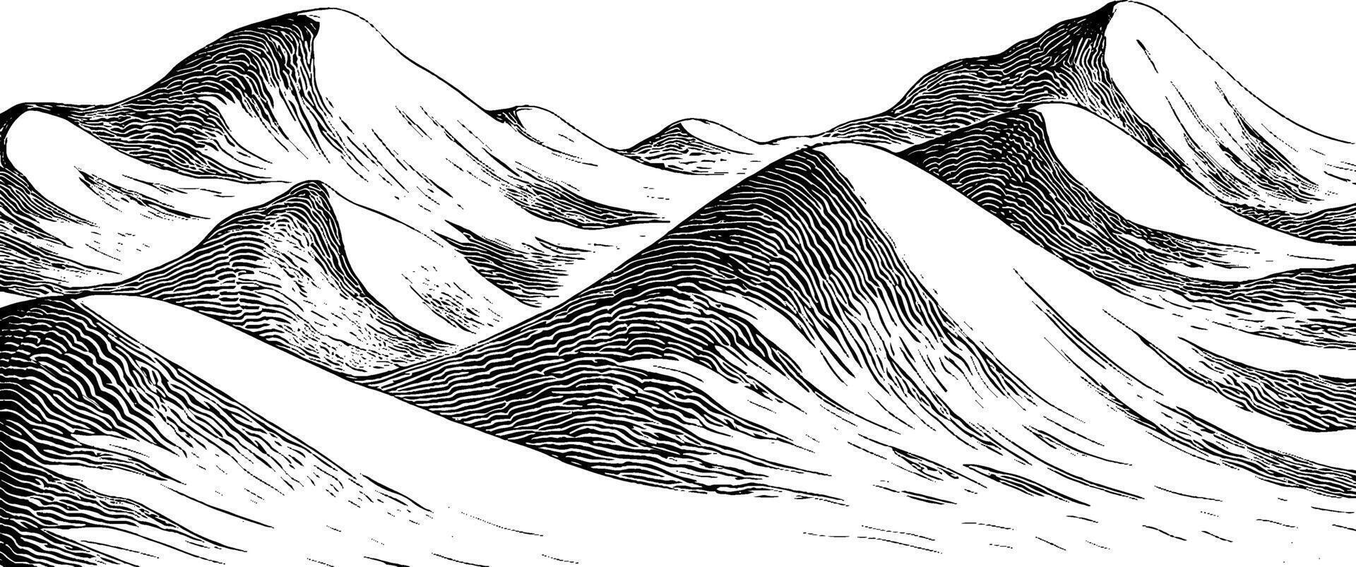 An artistic black and white illustration of rolling hills or waves, featuring intricate line work and varying patterns to depict depth and texture. Pro Vector