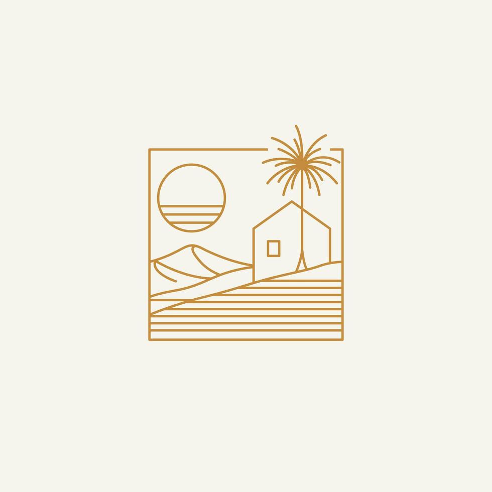 Minimal line art of a desert scene with a modern house, palm tree, sun, and hills in a square frame. Ideal for travel, boho, designs. Pro Vector