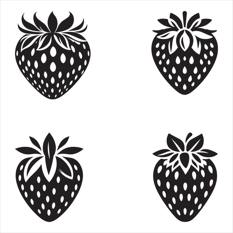 Set of Four Distinct Black and White Strawberry Illustrations Displaying Unique Leaf Designs and Seed Patterns vector