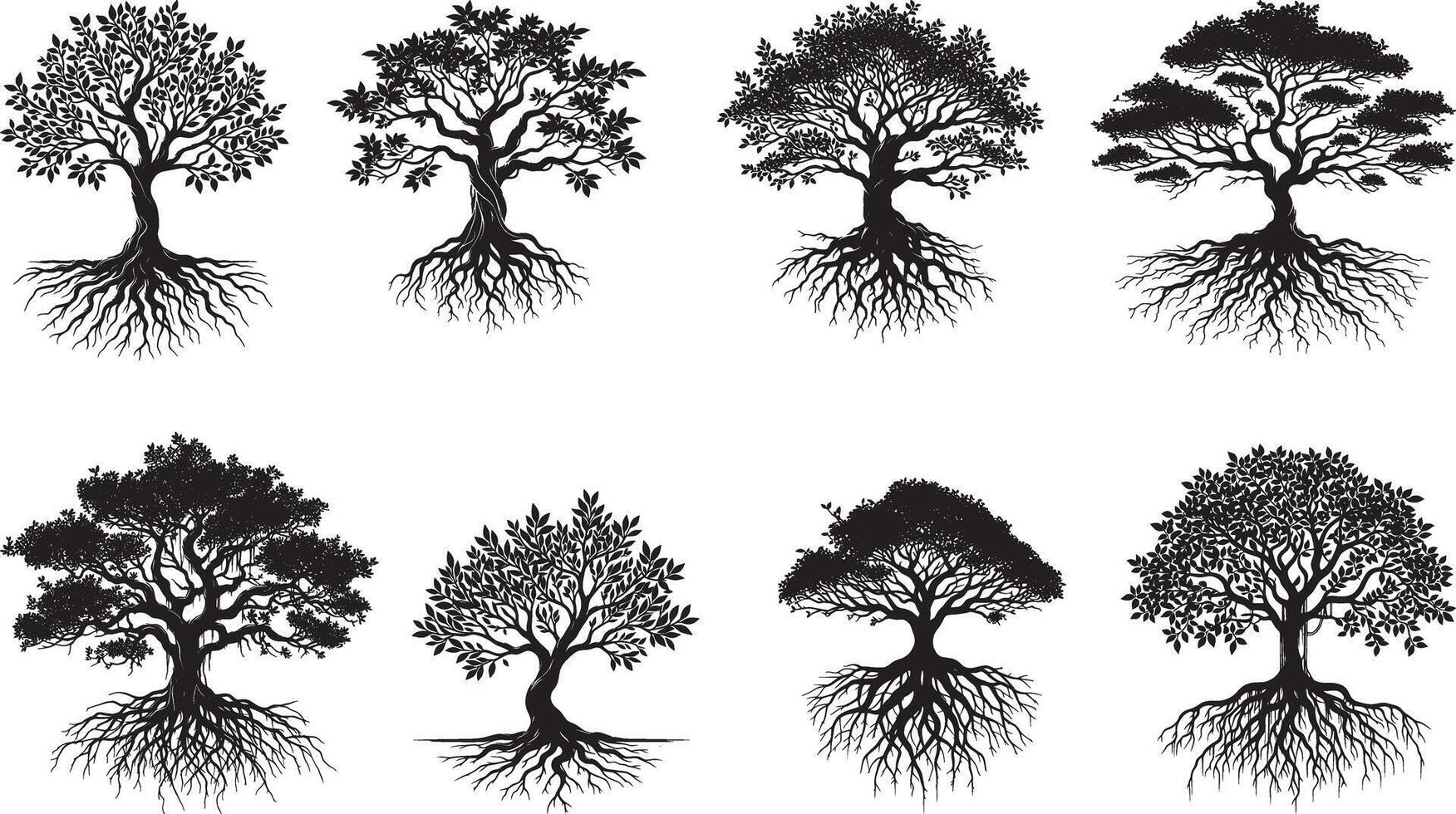 Intricate Black and White Tree Illustrations Showcasing Diverse Foliage, Branching Patterns, and Root Structures for Art and Botany vector