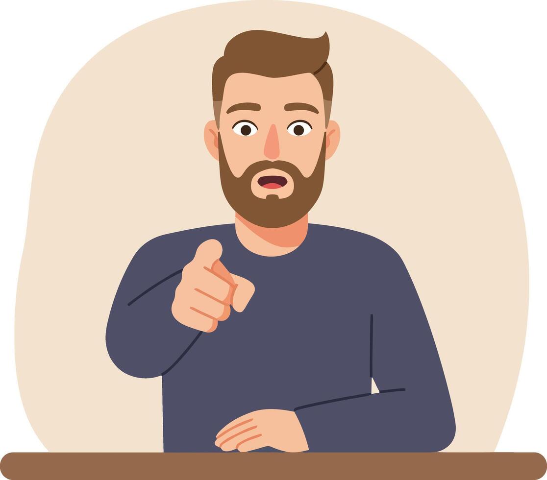 A man with a beard and surprised expression pointing directly at the viewer in a flat, minimal style illustration Pro Vector
